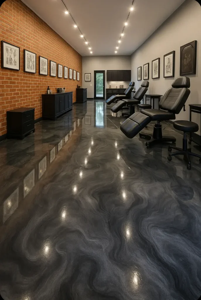 Elevate your studio with a floor that matches your craft. Our seamless epoxy is durable, easy to sanitize, and gives your shop a high-end, professional look.